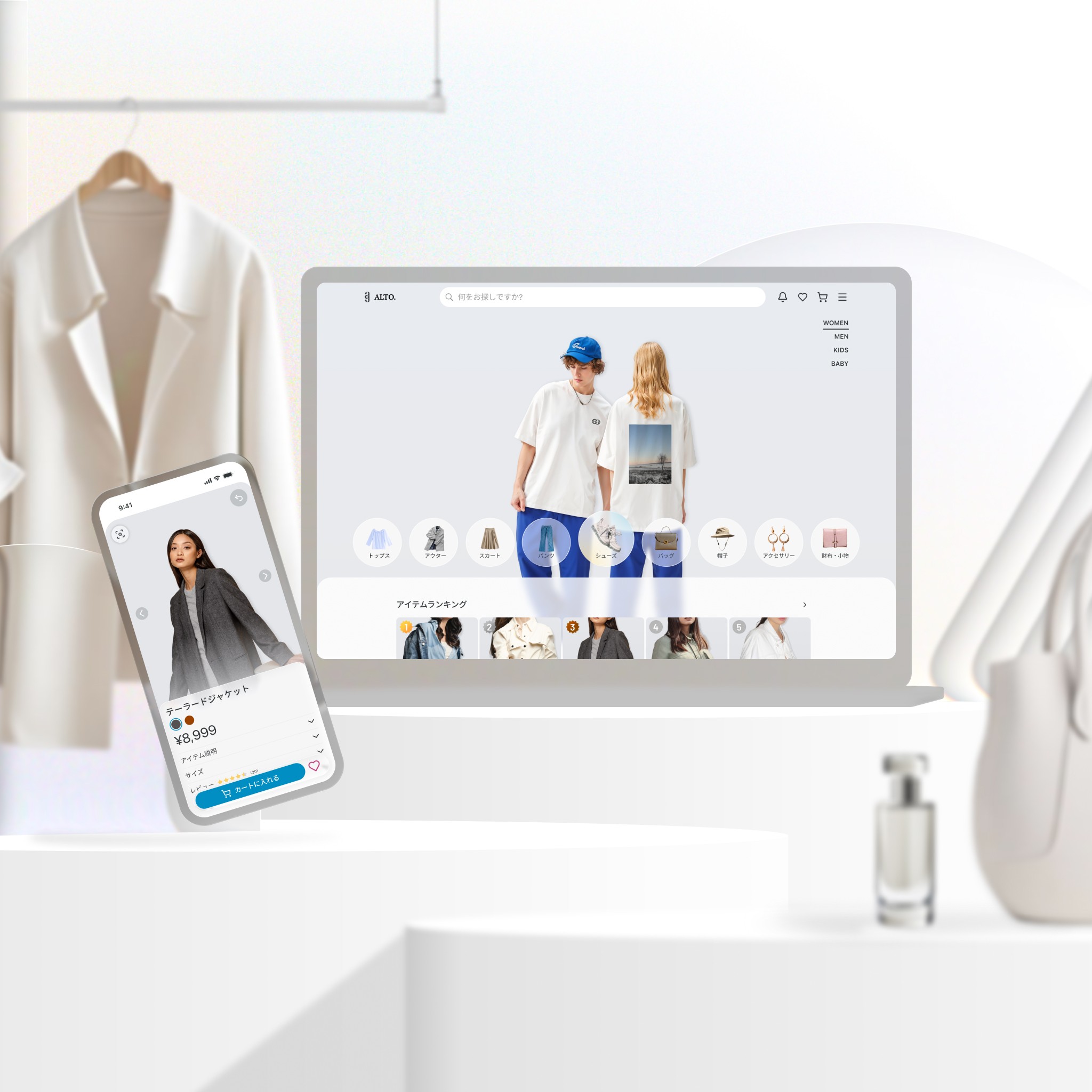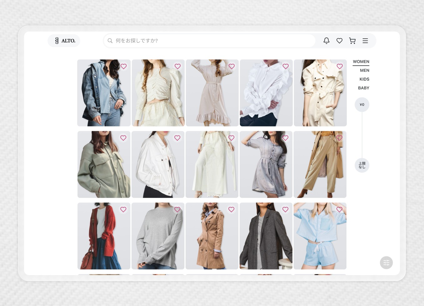 ビジュアル特化型のECアプリケーションのデザインコンセプト。複雑になりがちな従来のインターフェースを見直し、スムーズな操作感への移行に配慮しながら、商品そのものへの没入感を最大限に高める設計を行いました。ビジュアルの力を最大限に引き出すことで、ユーザーの購買意欲を自然に刺激することを目指します。