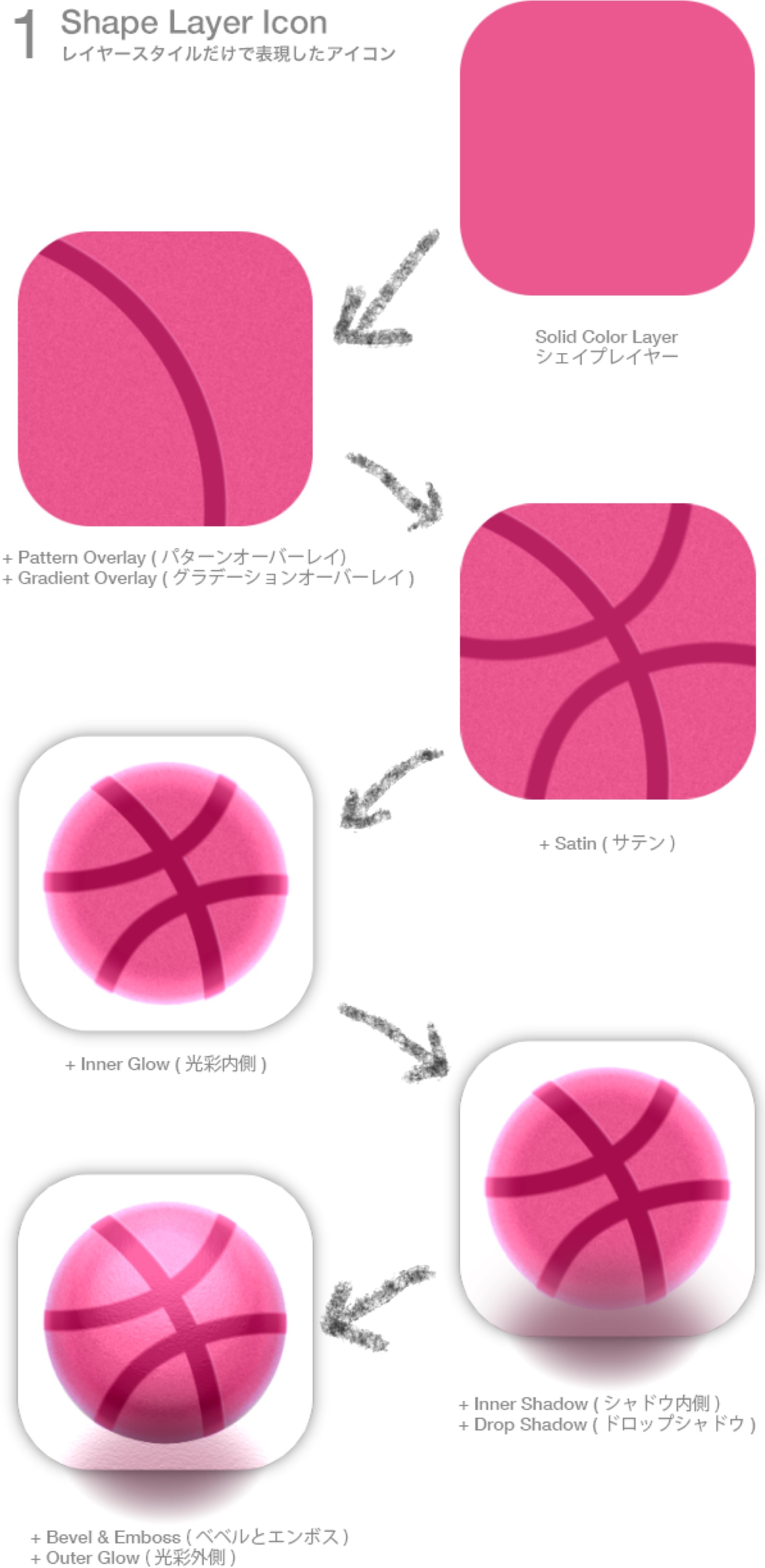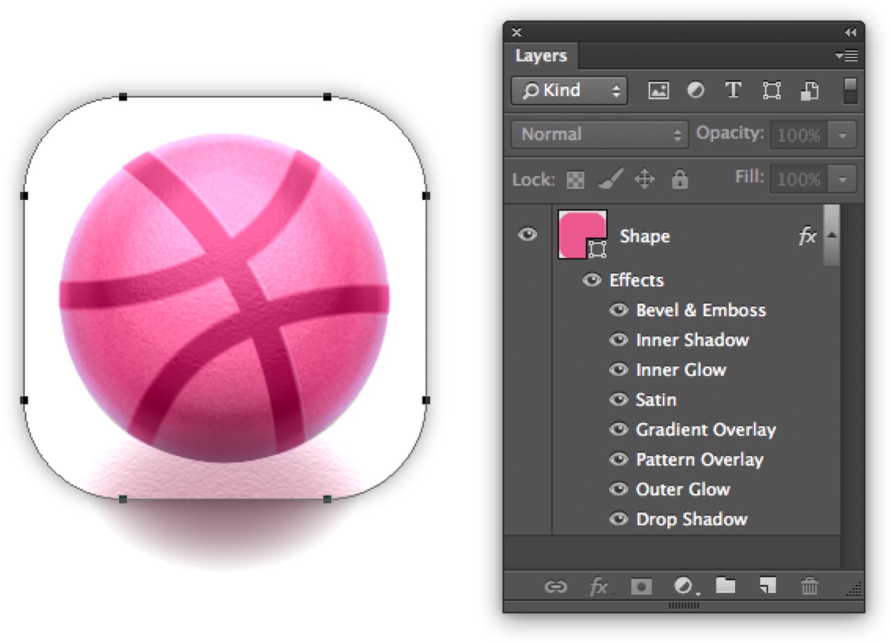 この Dribbble アイコンは Photoshop上で1つのレイヤーのレイヤースタイルだけで描いています