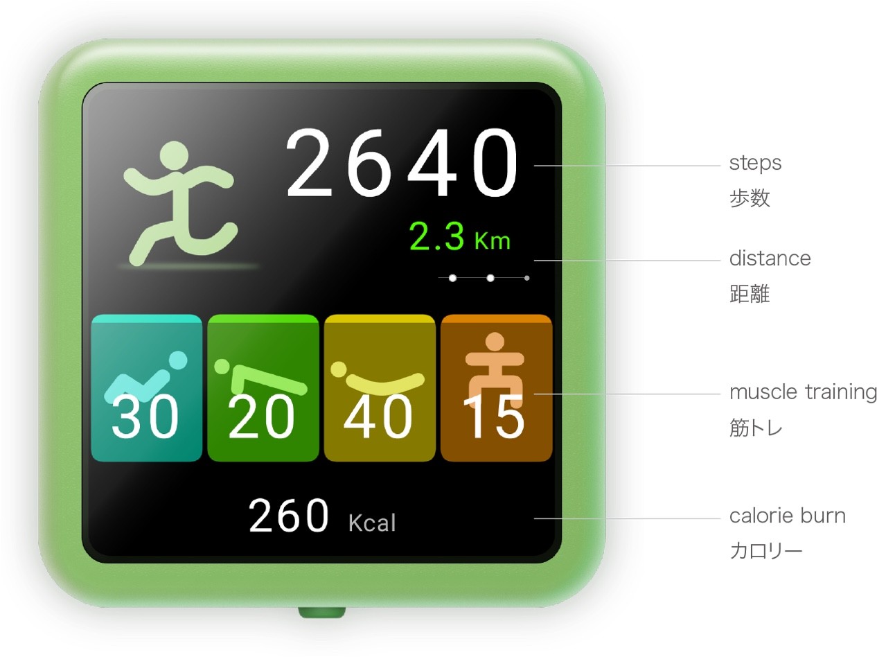 シンプル且つアクティブな操作で筋力トレーニングをサポートする、全く新しい歩数計のプロダクトデザインの提案です。