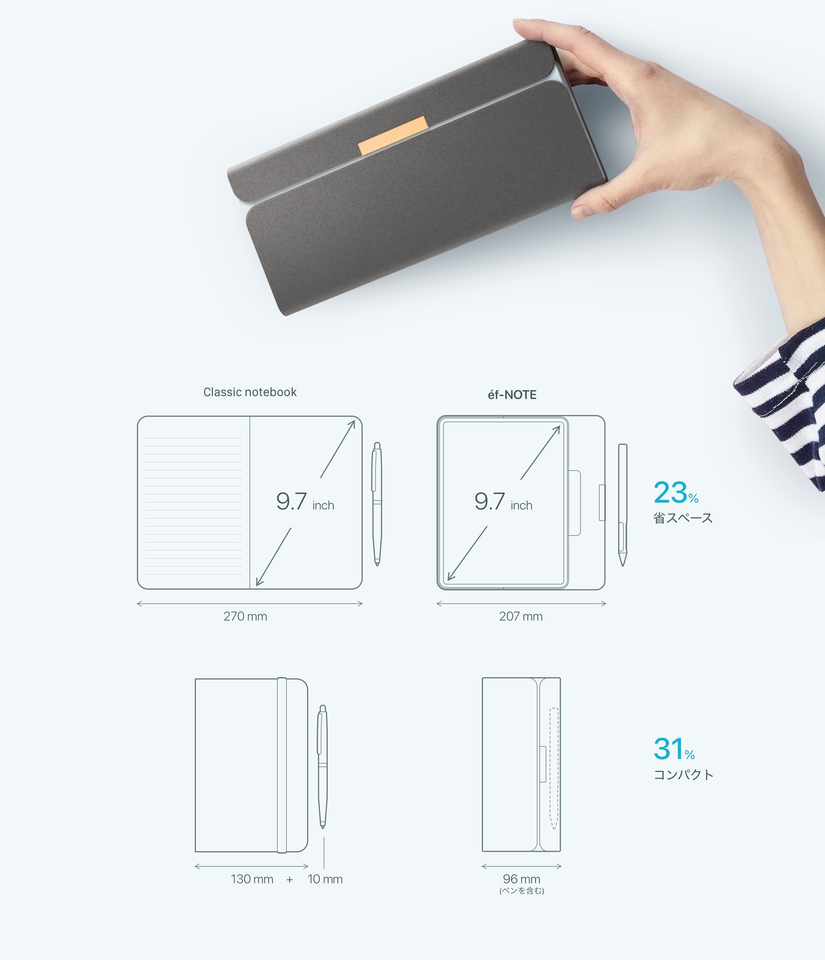 折りたたみ機構とペンも包み込むデザインによって持ち運び時のパッケージは最小限の大きさになり、メモやスケッチをとる機会をさらに増やすことができます。