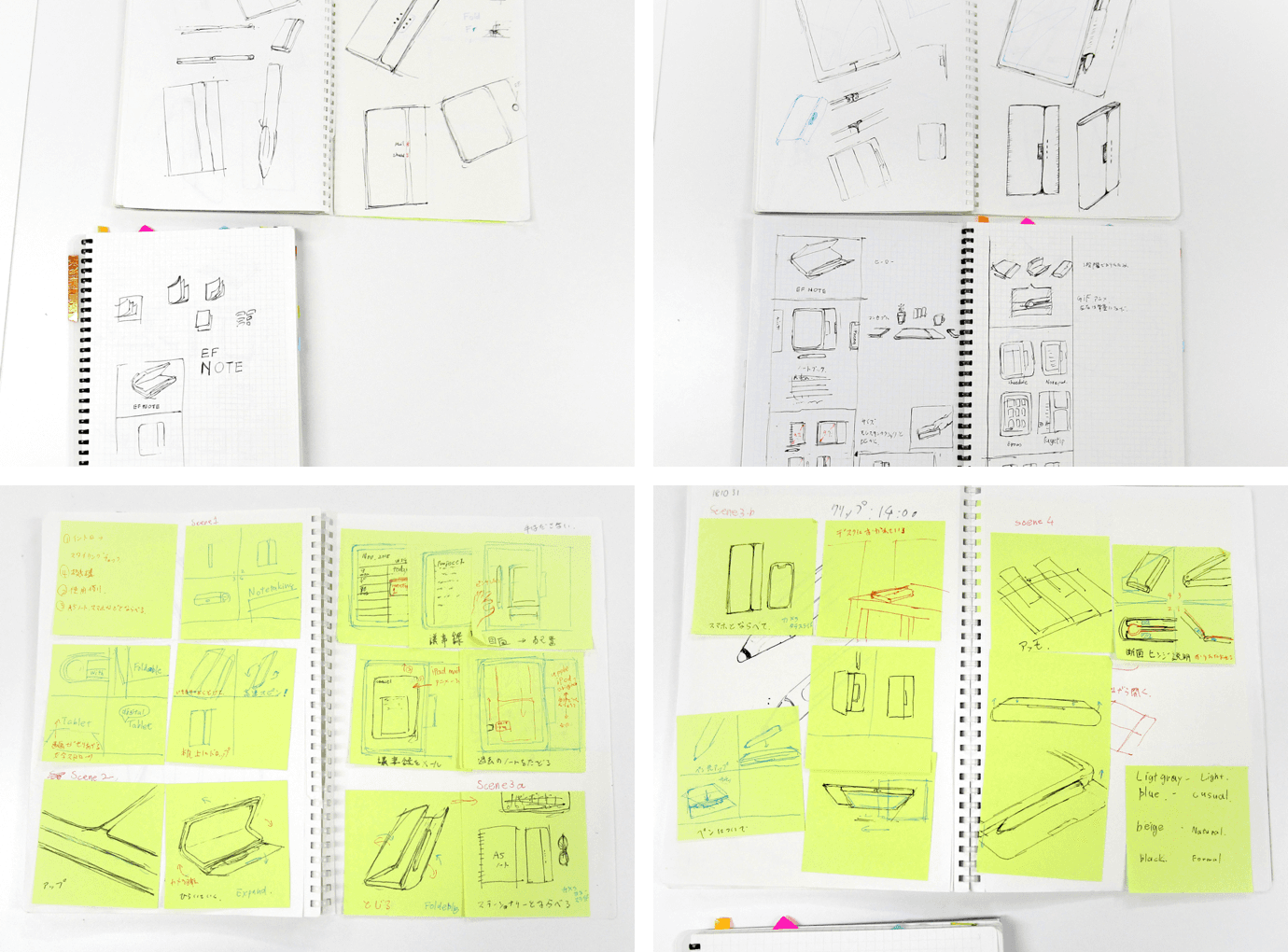 アイデアスケッチツール:B5ノート、エンピツ、ふせん寸法モックアップダンボールなどを使って実寸で最適なサイズ感を確認